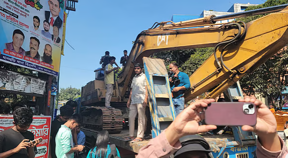 রাজধানীর ধানমন্ডি ৩২-এ দুটি বুলডোজার পৌঁছেছে। সোমবার সকাল ১২টার দিকে ট্রাকে করে বুলডোজার দুটি ধানমন্ডি ৩২ নম্বরে নেওয়া হয়। এক দল তরুণ এগুলোর সঙ্গে আছেন। এ সময় তাদের বিভিন্ন স্লোগান